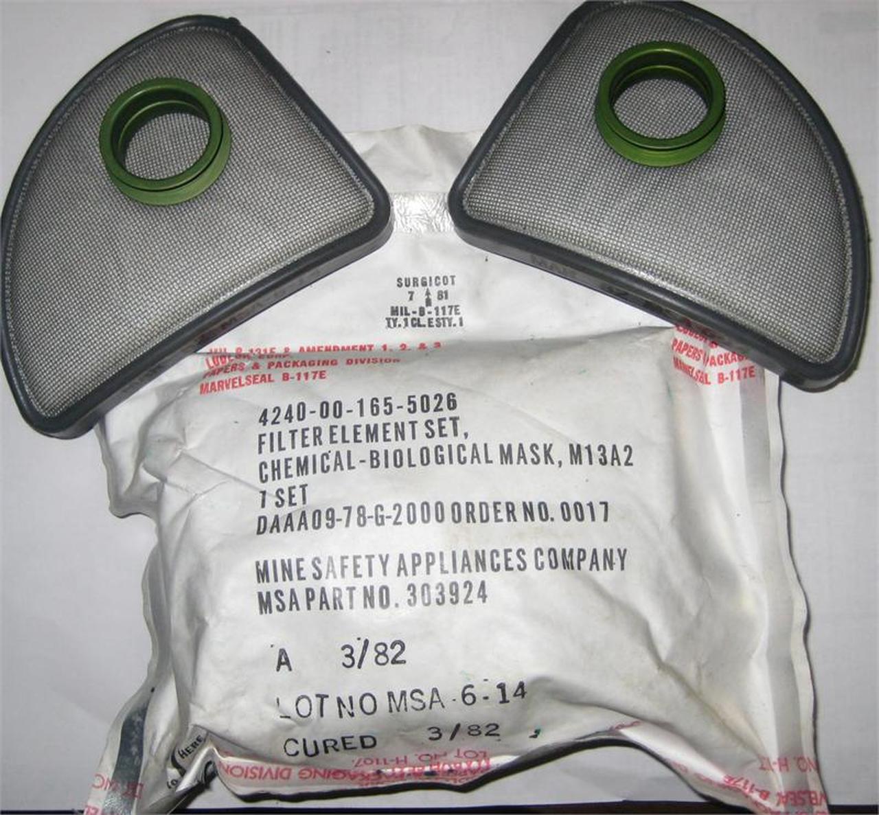 Equip your M17, A1, or A2 masks with this authentic US Military Filter Element Set, designed for optimal protection against nuclear, biological, and chemical threats. Manufactured by Mine Safety Appliances Company, this NOS set ensures reliability and safety.