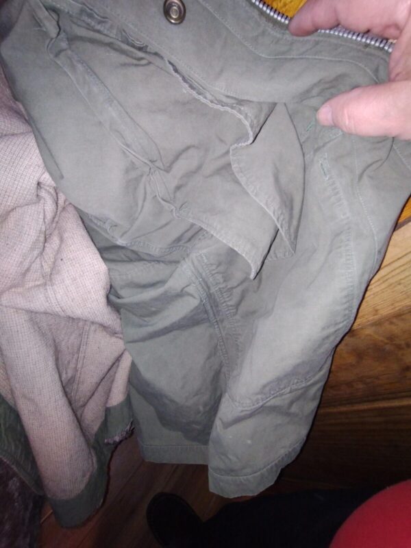 US Korean War Era Winter field parka with dark brown alpaca Liner (removable) M1947. This is more rare USMC / USN issued M1947 with out the tunnel for a belt. Parka is sized as a medium and should fit like one as well over clothing.