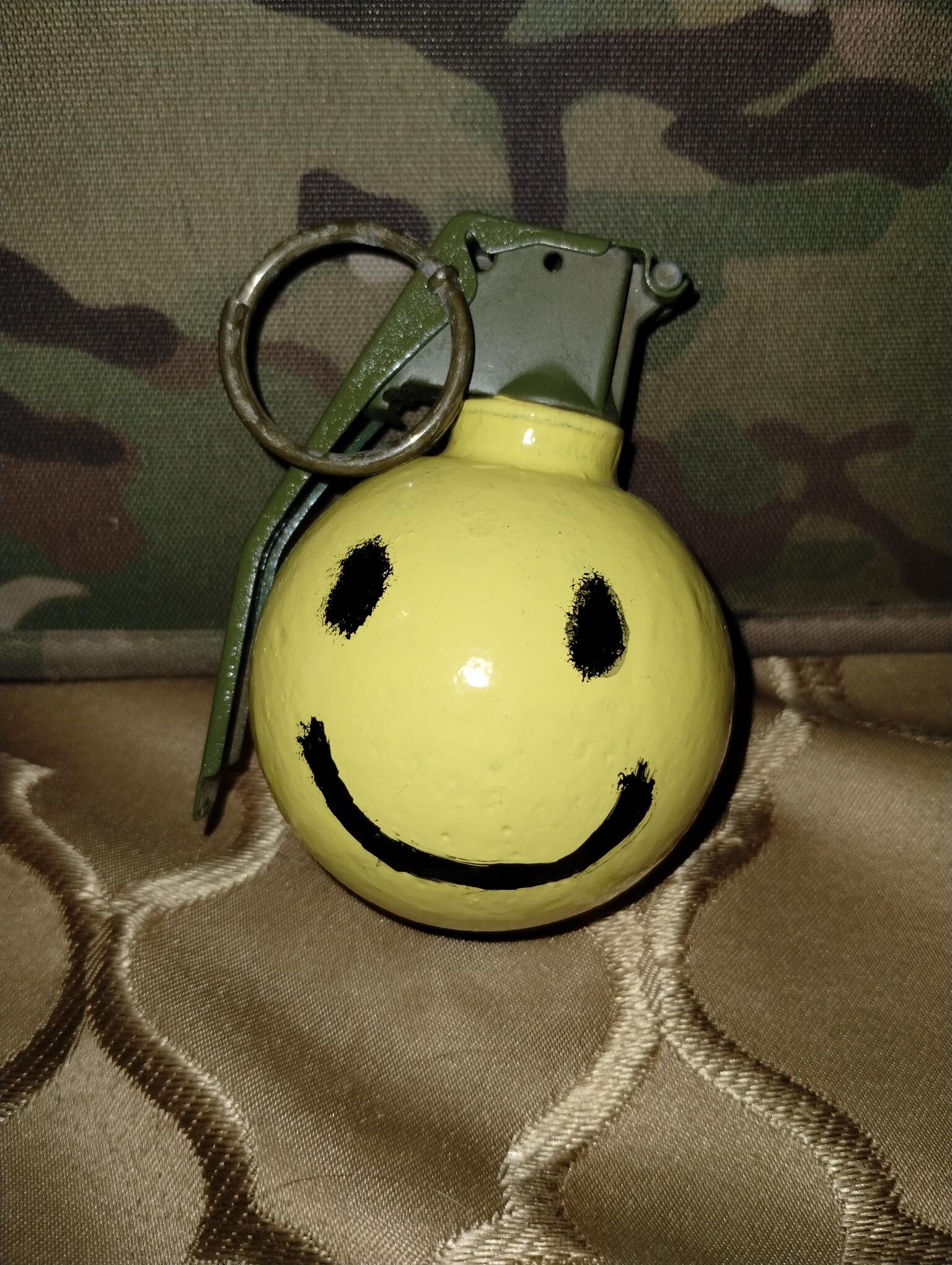 4 PIECE YELLOW LEMON GRENADE. DEMILLED HOLE IN BOTTOM.  This novelty “Lemon Head” grenade is a way to bring a smile into your friend or enemies life!  Painted yellow with a smile painted on the face.  Great gag gift!