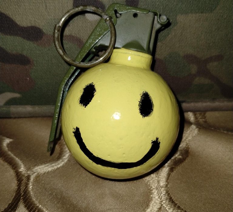 4 PIECE YELLOW LEMON GRENADE. DEMILLED HOLE IN BOTTOM.  This novelty “Lemon Head” grenade is a way to bring a smile into your friend or enemies life!  Painted yellow with a smile painted on the face.  Great gag gift!