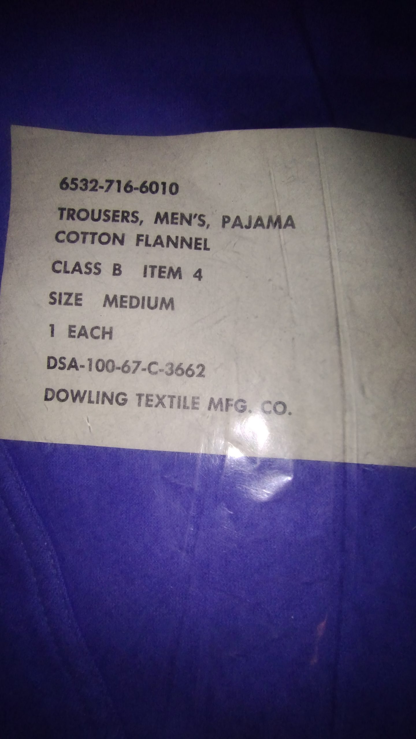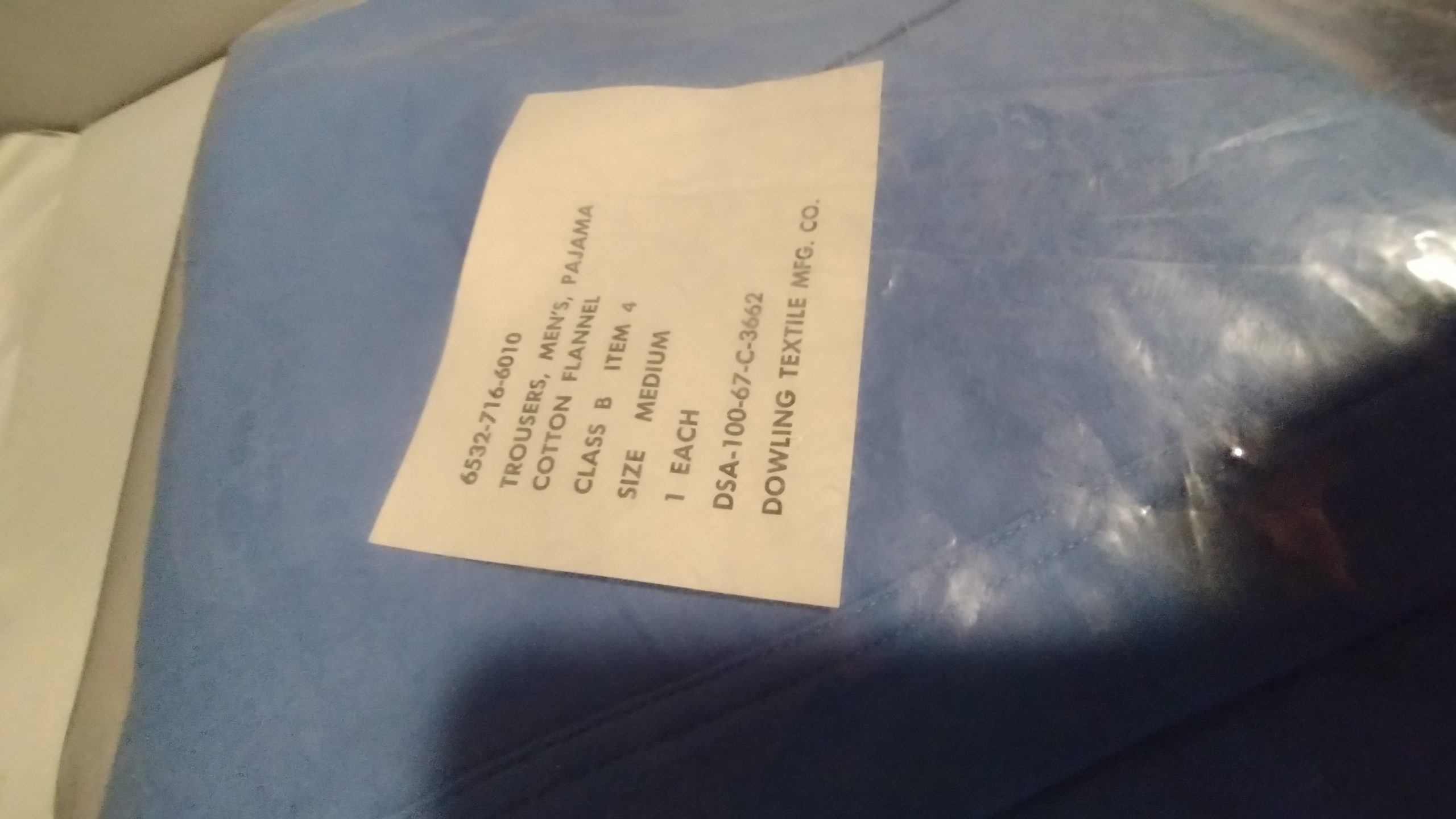 Step back in time with these original Vietnam era Men’s Pajama Trousers, crafted from soft blue cotton flannel. Unissued and preserved in their original poly-bag, these trousers are a testament to historical military apparel, manufactured by Dowling Textile Mfg. Co. in 1967.