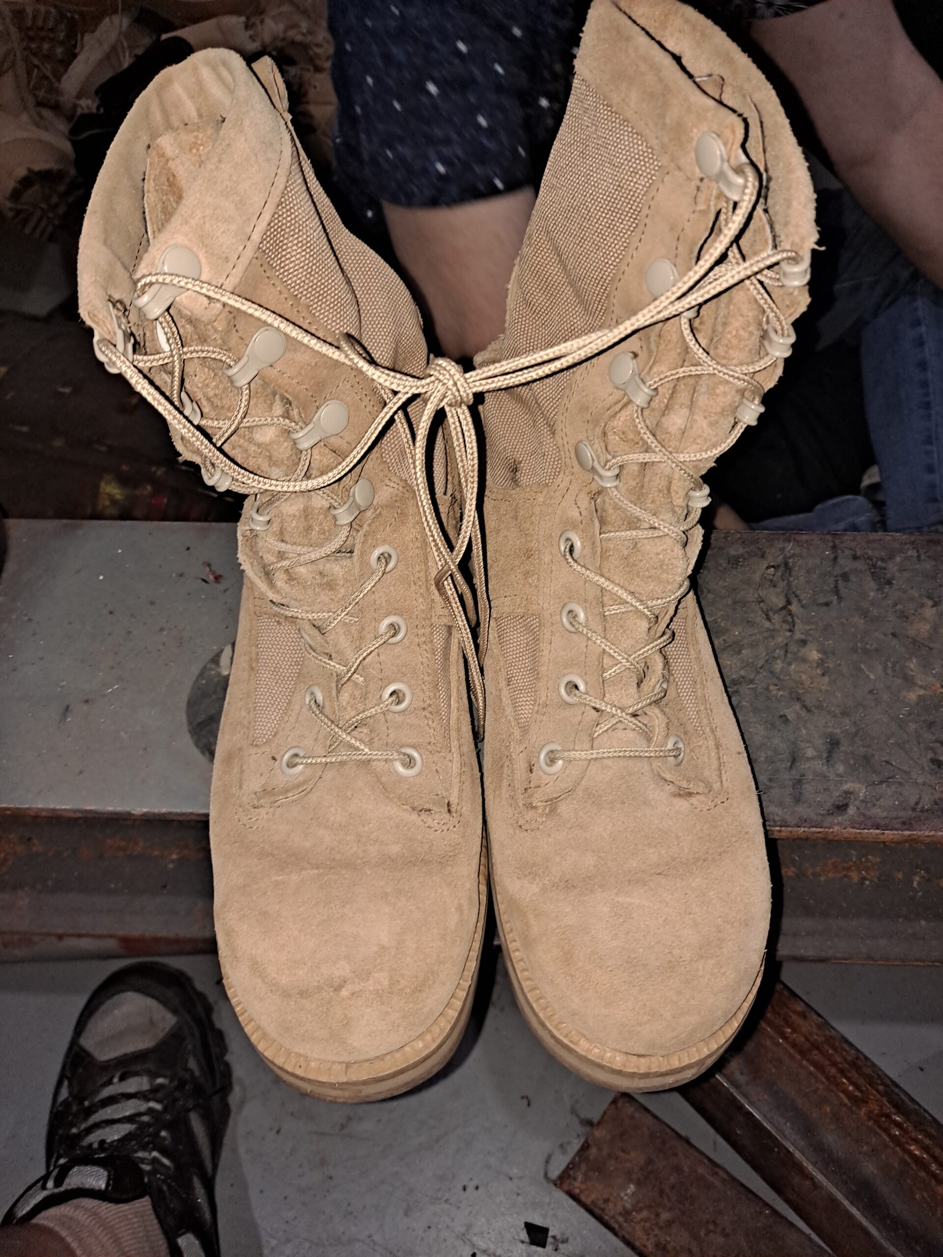 Used, Steel Toe Boots, Tan made by Wellco size 4 1/2 Wide, excellent condition.