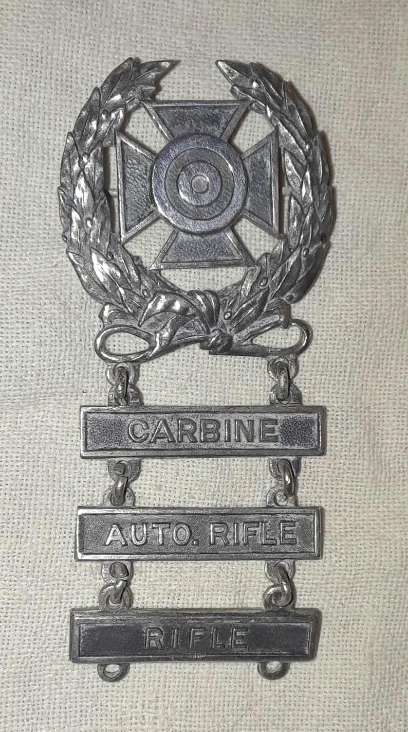 Honor the legacy of WWII with this sterling silver US military Expert Rifle Marksman badge, featuring Rifle, Auto Rifle, and Carbine Tabs. A distinguished piece in excellent era-used condition, perfect for collectors and history enthusiasts.
